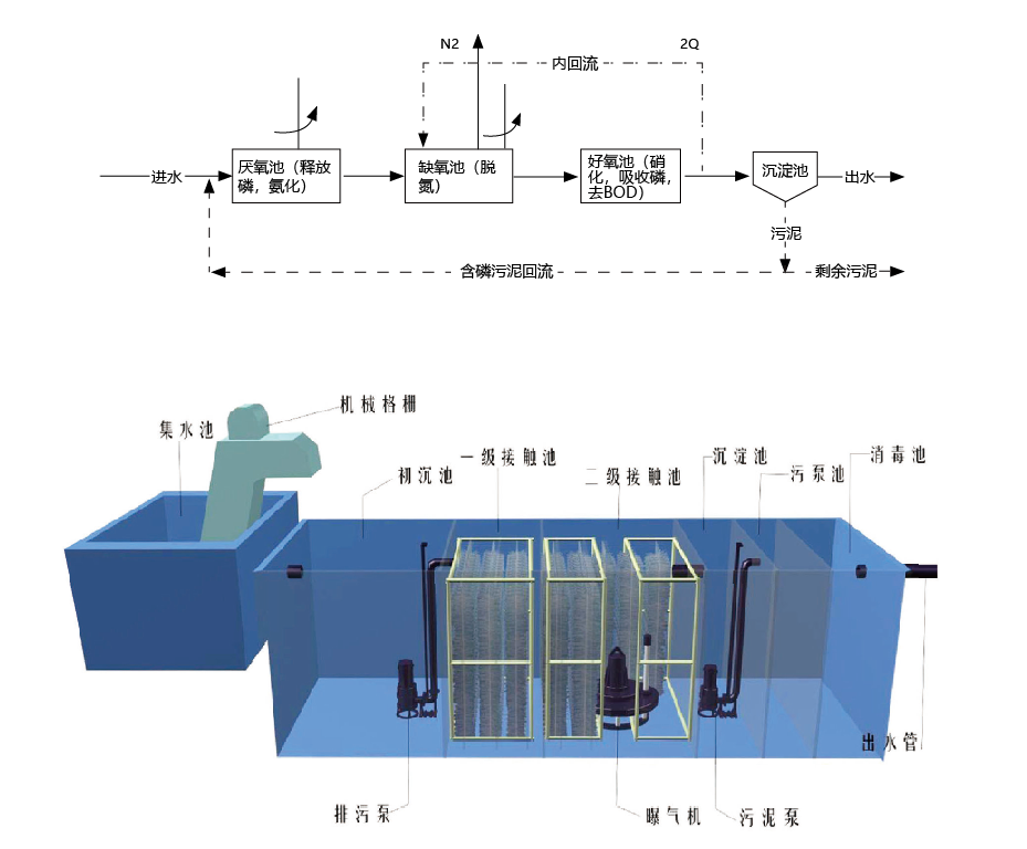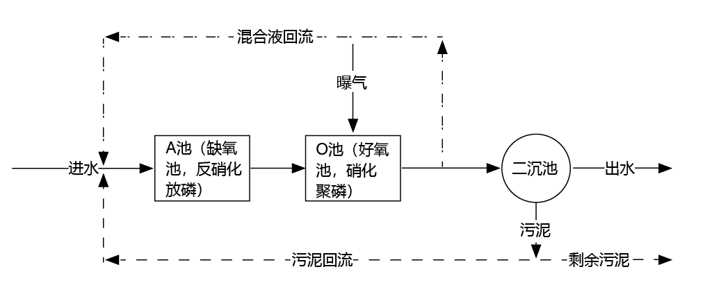 A/O法:具有脱氮除磷的作用,A段为缺氧池,进行反硝化作用,同时释磷菌放磷,O段为好氧池,进行硝化作用,同时聚磷菌吸 收水中的磷类化合物。