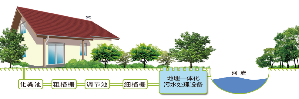 3、地埋式一体化污水处理设备采用水下射流曝气装置,无需鼓风机等设备,系统简单,除吸气口外,其余部分潜入水中运行,噪音小,设备安全可靠;由于其高速的射流流态,液气混合充分,氧吸收率高,动力效率高,比传统曝气池处理效率高3~4倍,曝气时间可明显缩短。