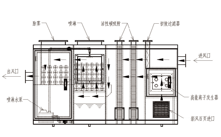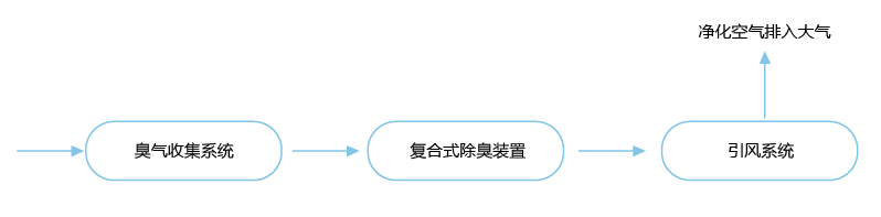 复合式除臭装置的工作流程:恶臭气体首先经过独特的过滤单元,绝大部分的颗粒物质被截留去除:恶臭气体再与高能离子电场的离子新风混合反应;然后经过活性碳吸附进一步降解异味和消毒,最后经过喷淋及除雾洁净的空气经离心风机排出。